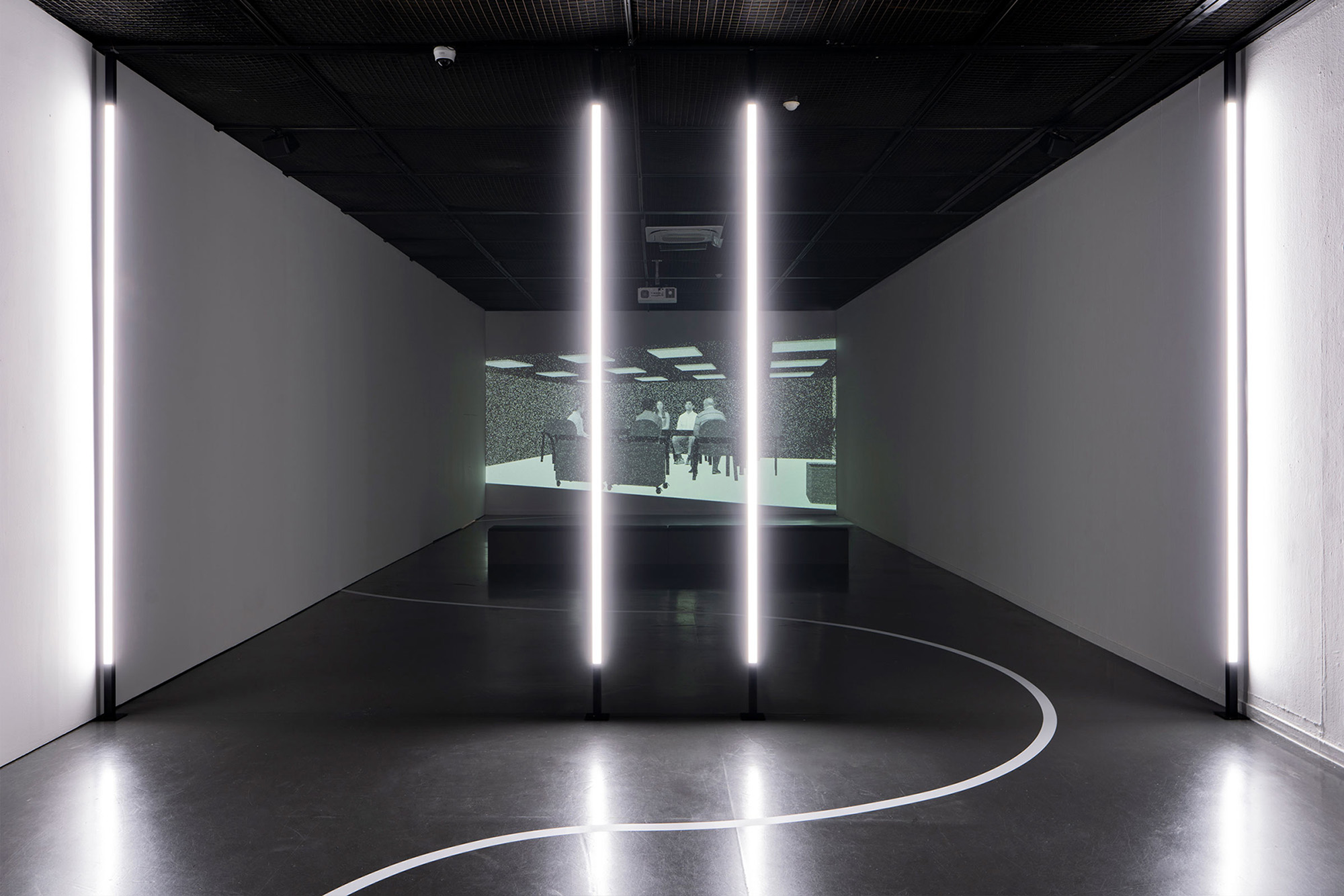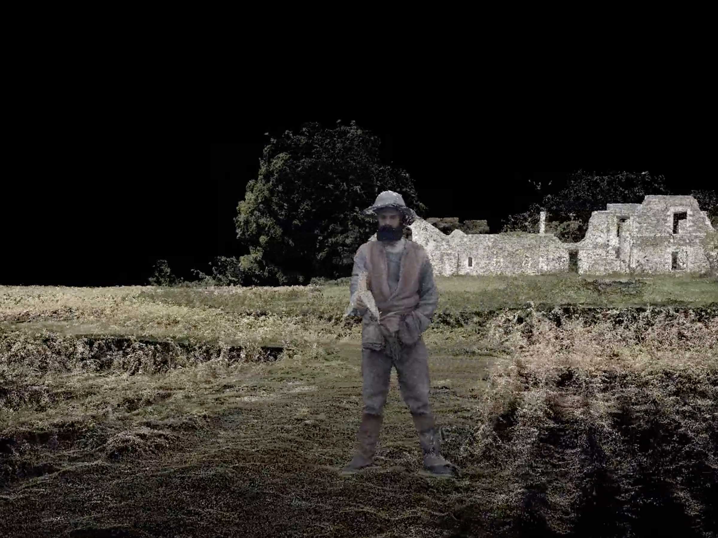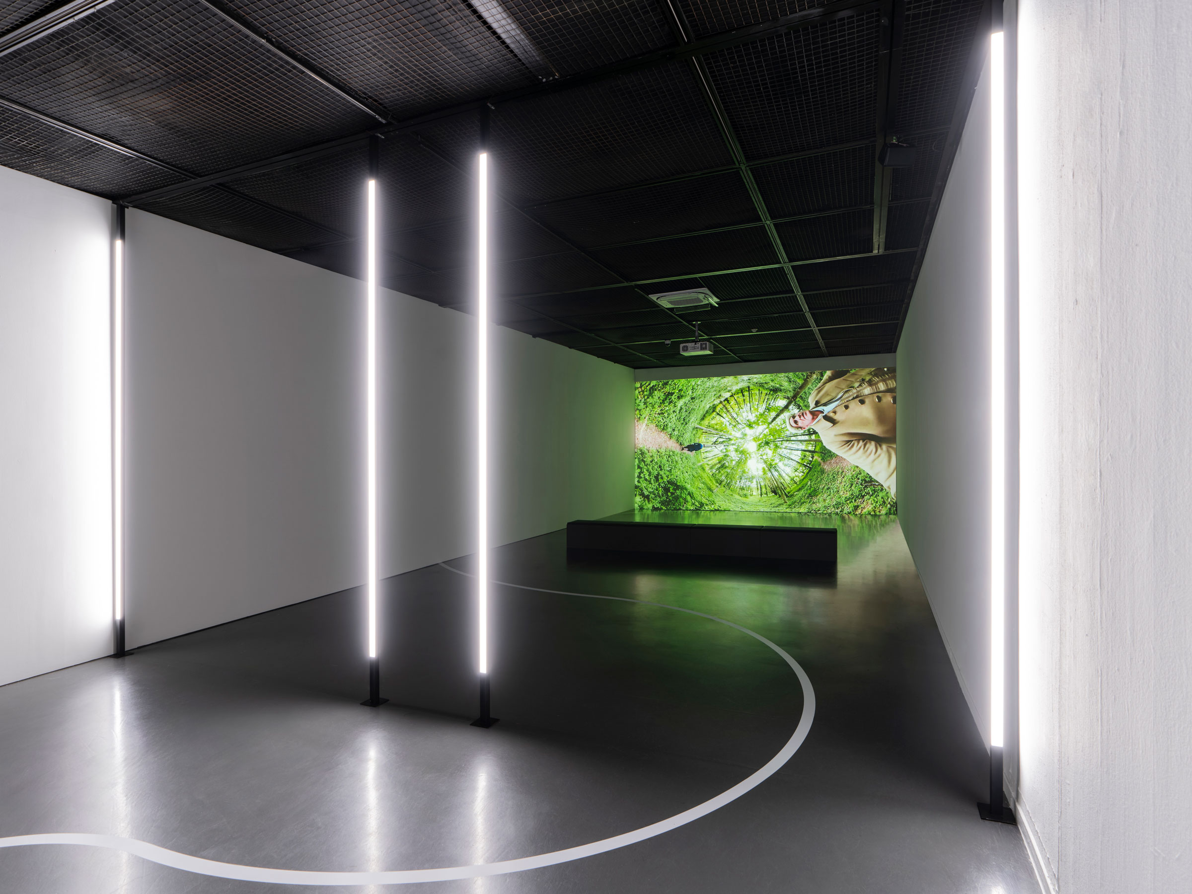 1 0 0 9 worked on animations for the film, using photogrammetry and point cloud visualisations to envisage inaccessible spaces and collaged places, and in addition designed the exhibition when the work was exhibited at Seoul Mediacity Biennale. A combination of programmed lighting and graphical surface treatments oriented the viewer, inviting them to measure themselves against their surroundings and in relation to the film.