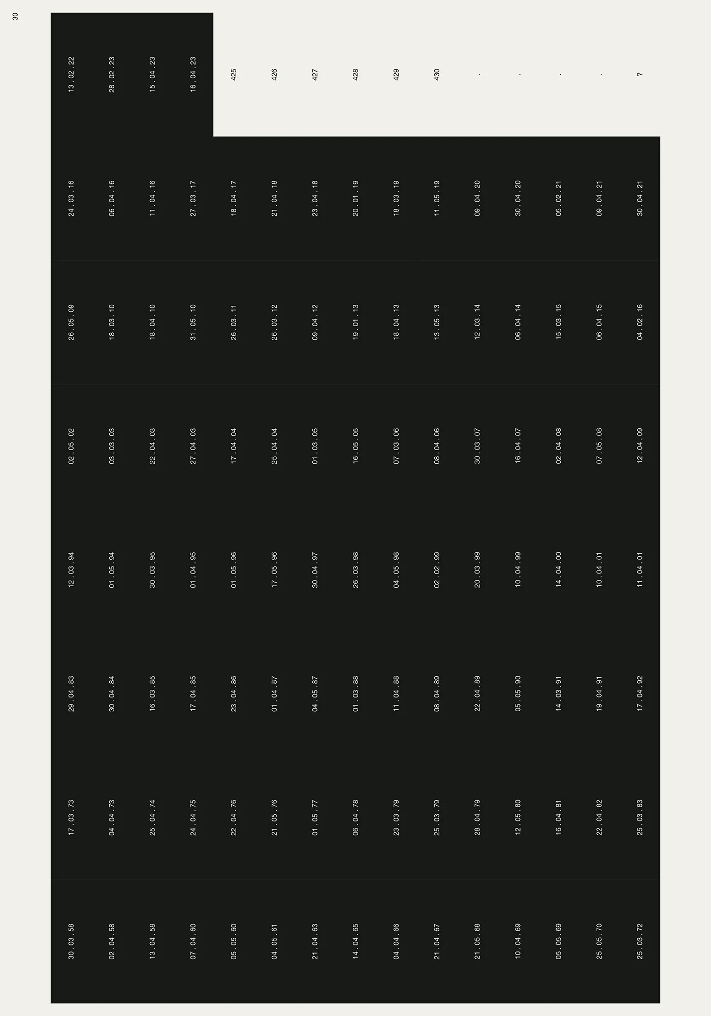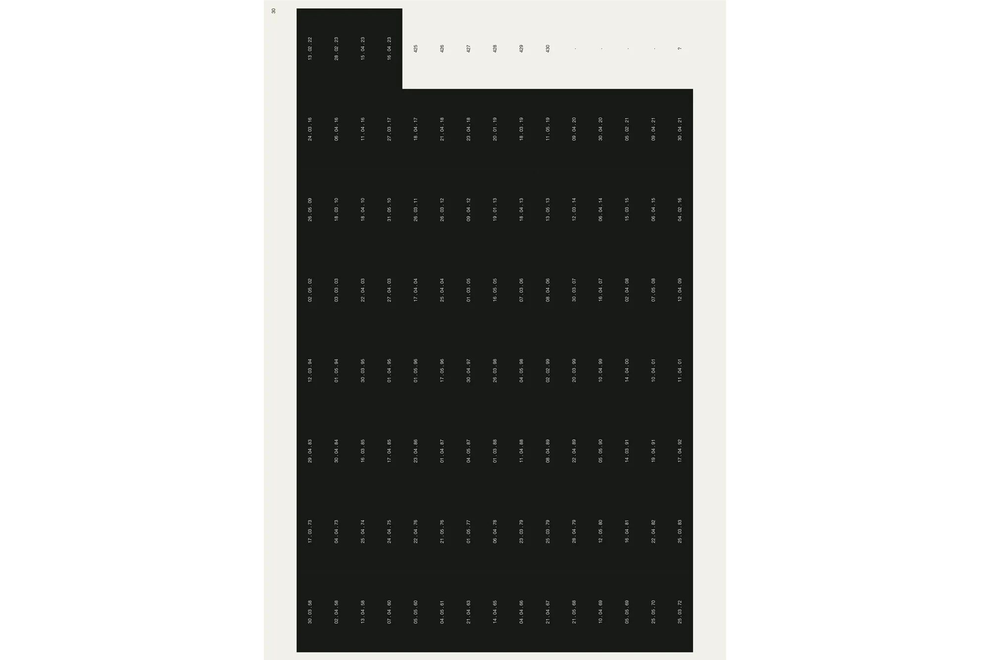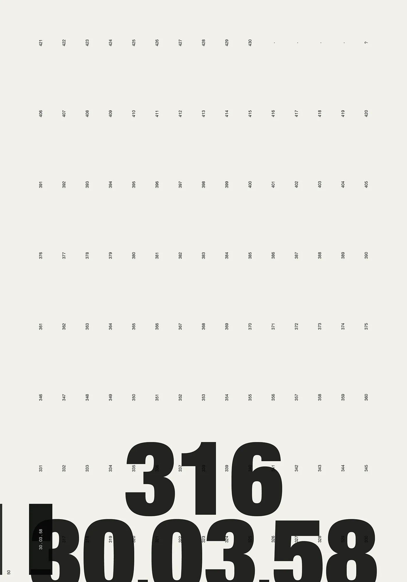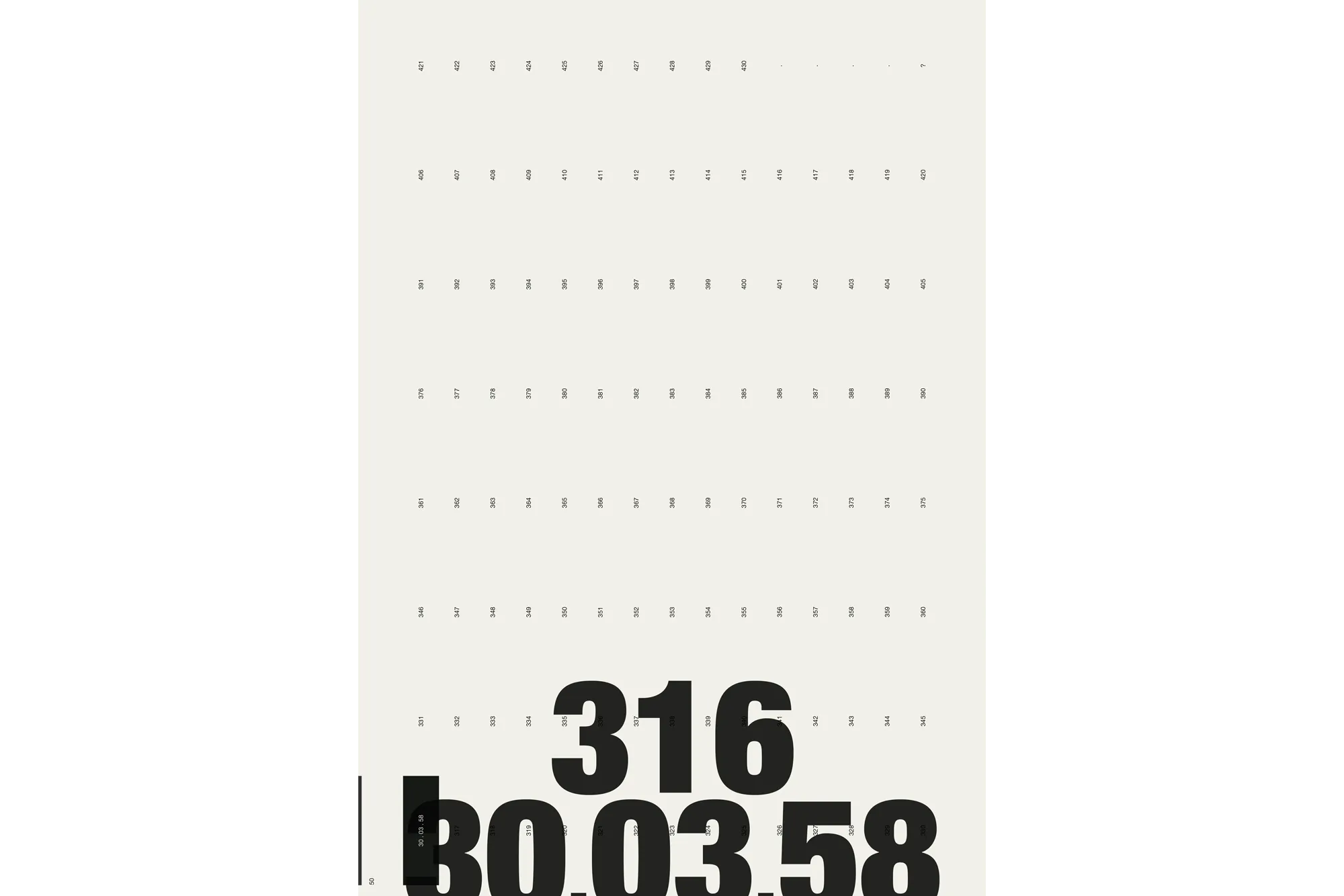 Each key date is presented across two pages — the New York Times front page paired with a data visualisation of the evolving situation. A grid page lists every parts per million value from 316 to 424, each number becoming a black rectangle marked with its date. By the time the reader reaches 424, the page is nearly solid black. The 430 threshold — the point of no return — marks the limit. The Keeling curve runs along the spine. A secondary visualisation emerges on the bottom edge, generated by a heading system combining parts per million values with their dates (e.g. 323, 14.04.65 _ 356, 22.04.89 _ 422, 28.02.23) — the consistent placement of day, month, and year producing a graphic rhythm visible on the closed book.