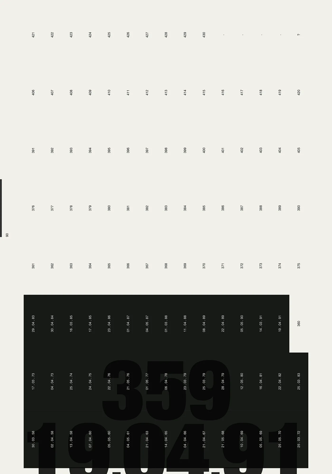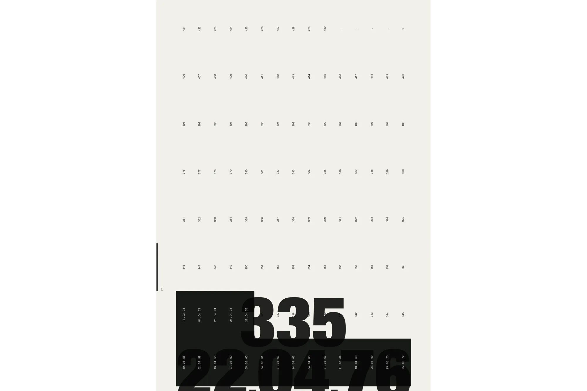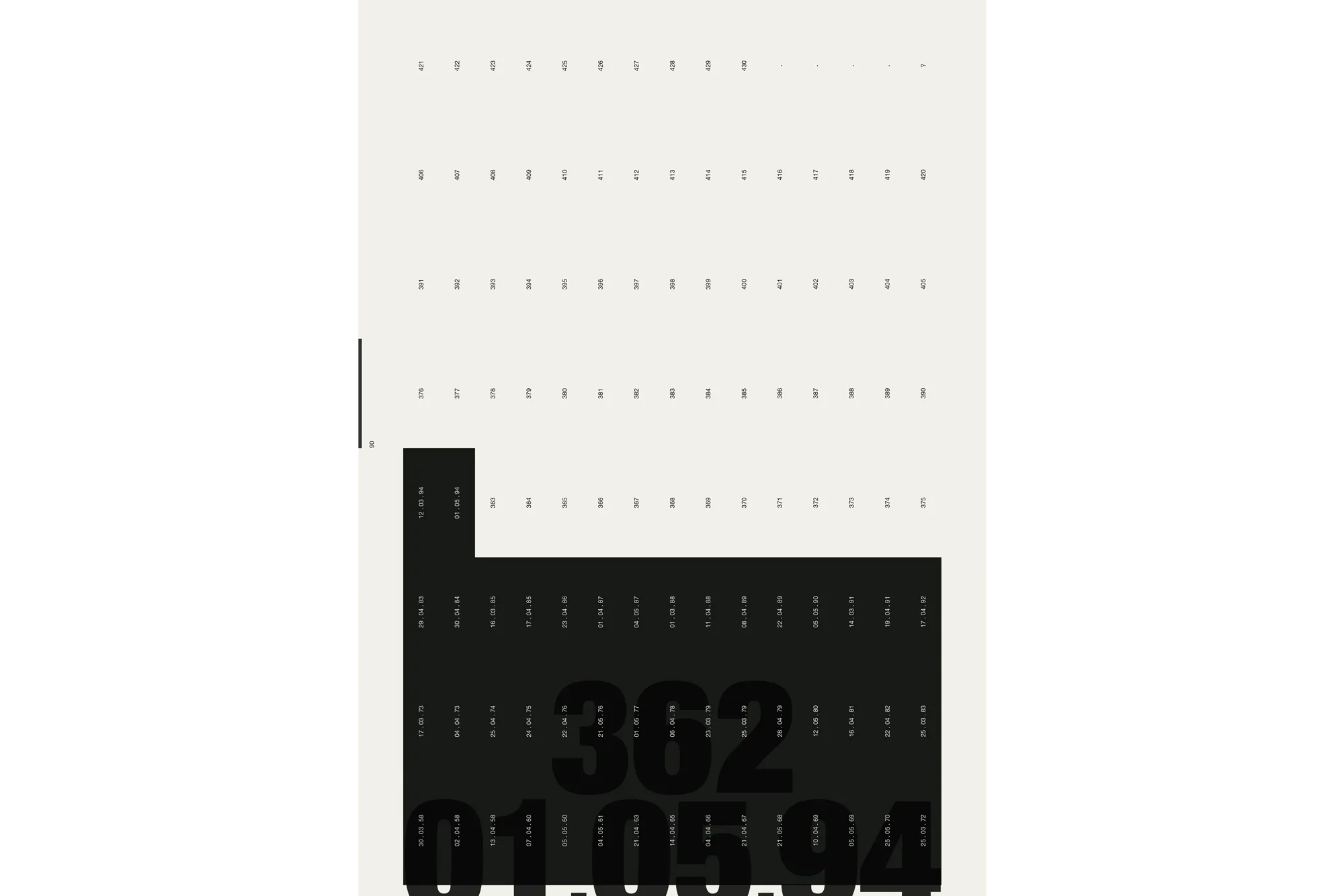 Each key date is presented across two pages — the New York Times front page paired with a data visualisation of the evolving situation. A grid page lists every parts per million value from 316 to 424, each number becoming a black rectangle marked with its date. By the time the reader reaches 424, the page is nearly solid black. The 430 threshold — the point of no return — marks the limit. The Keeling curve runs along the spine. A secondary visualisation emerges on the bottom edge, generated by a heading system combining parts per million values with their dates (e.g. 323, 14.04.65 _ 356, 22.04.89 _ 422, 28.02.23) — the consistent placement of day, month, and year producing a graphic rhythm visible on the closed book.