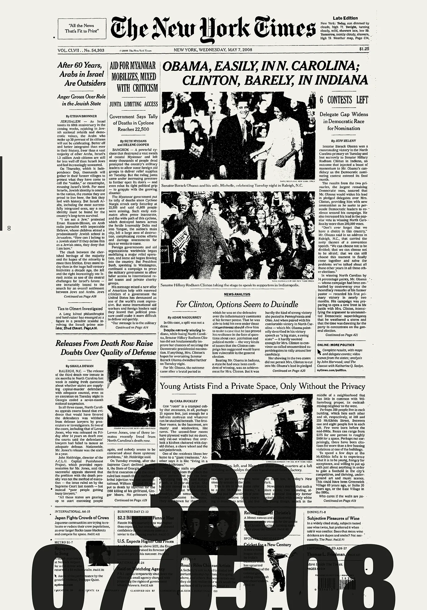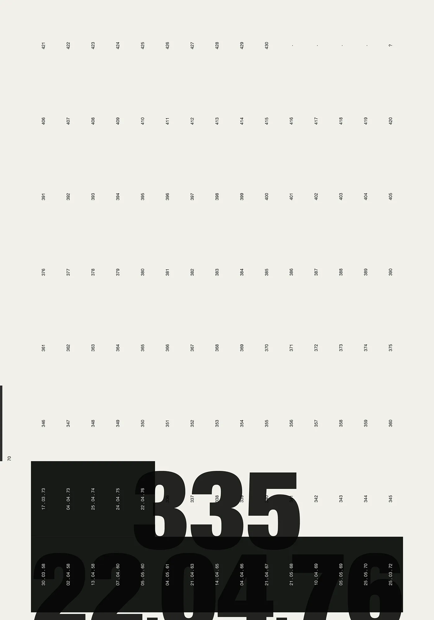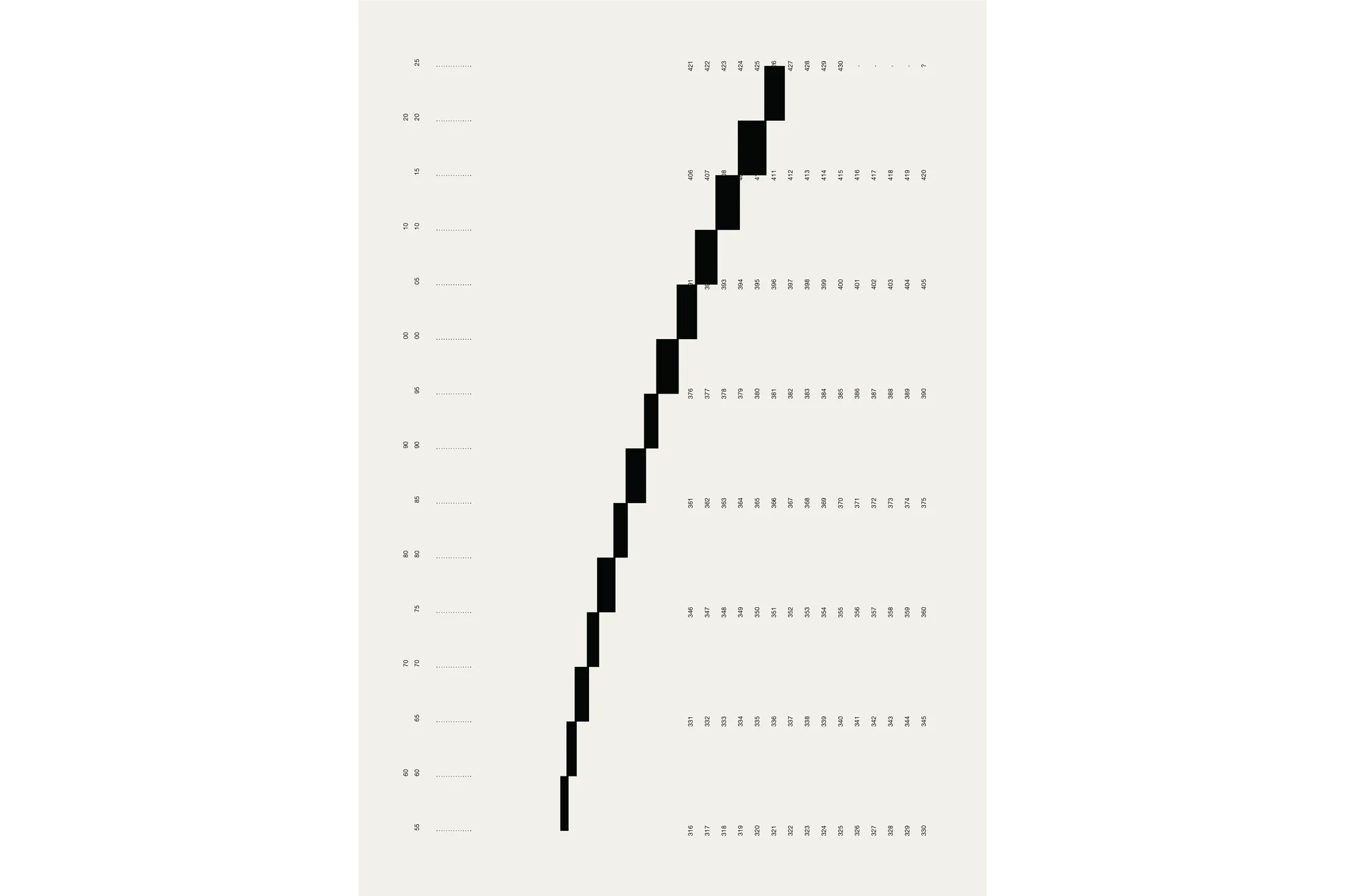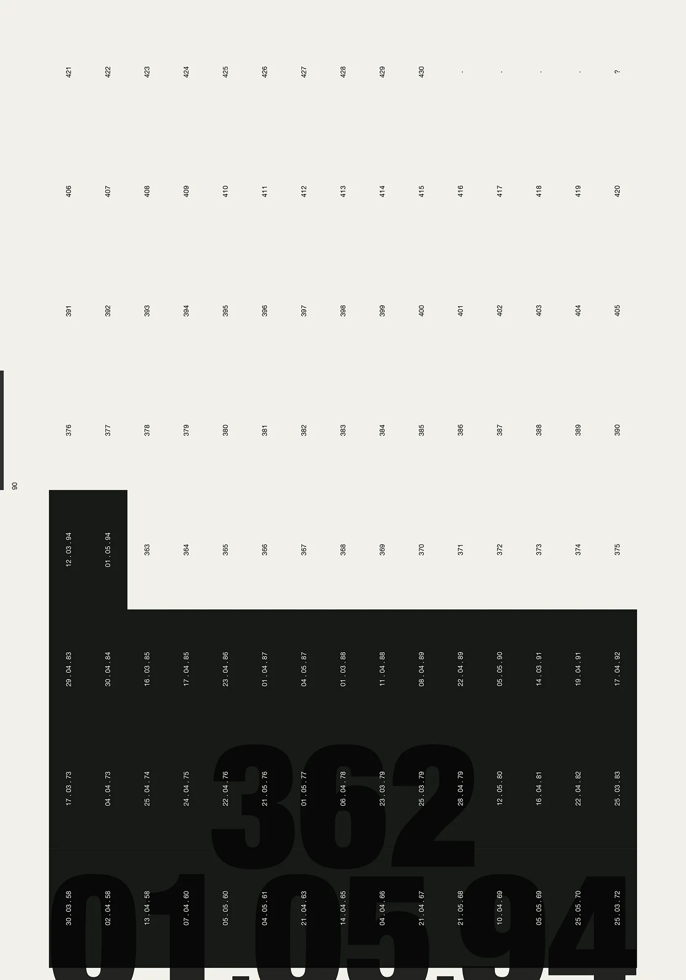 Each key date is presented across two pages — the New York Times front page paired with a data visualisation of the evolving situation. A grid page lists every parts per million value from 316 to 424, each number becoming a black rectangle marked with its date. By the time the reader reaches 424, the page is nearly solid black. The 430 threshold — the point of no return — marks the limit. The Keeling curve runs along the spine. A secondary visualisation emerges on the bottom edge, generated by a heading system combining parts per million values with their dates (e.g. 323, 14.04.65 _ 356, 22.04.89 _ 422, 28.02.23) — the consistent placement of day, month, and year producing a graphic rhythm visible on the closed book.