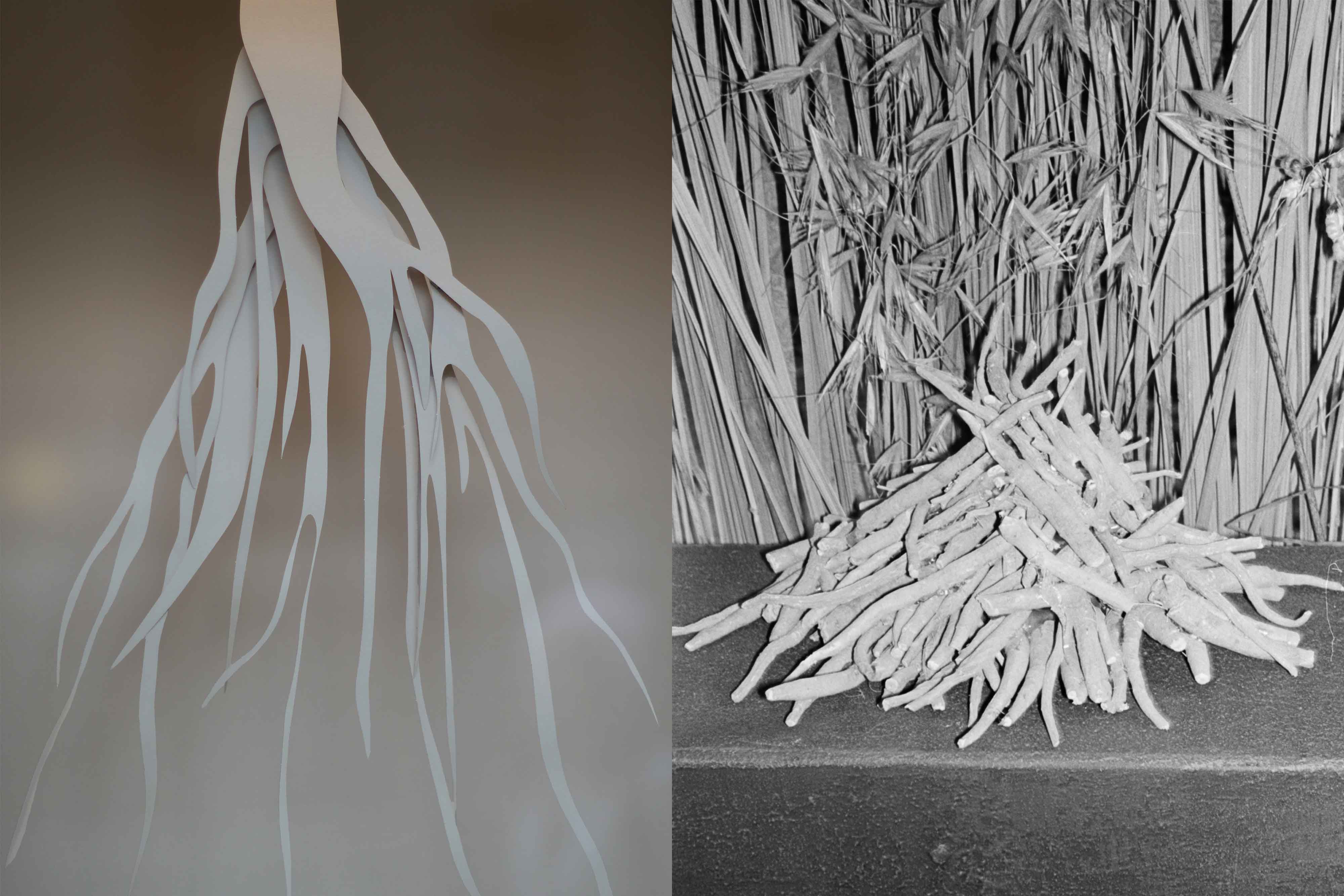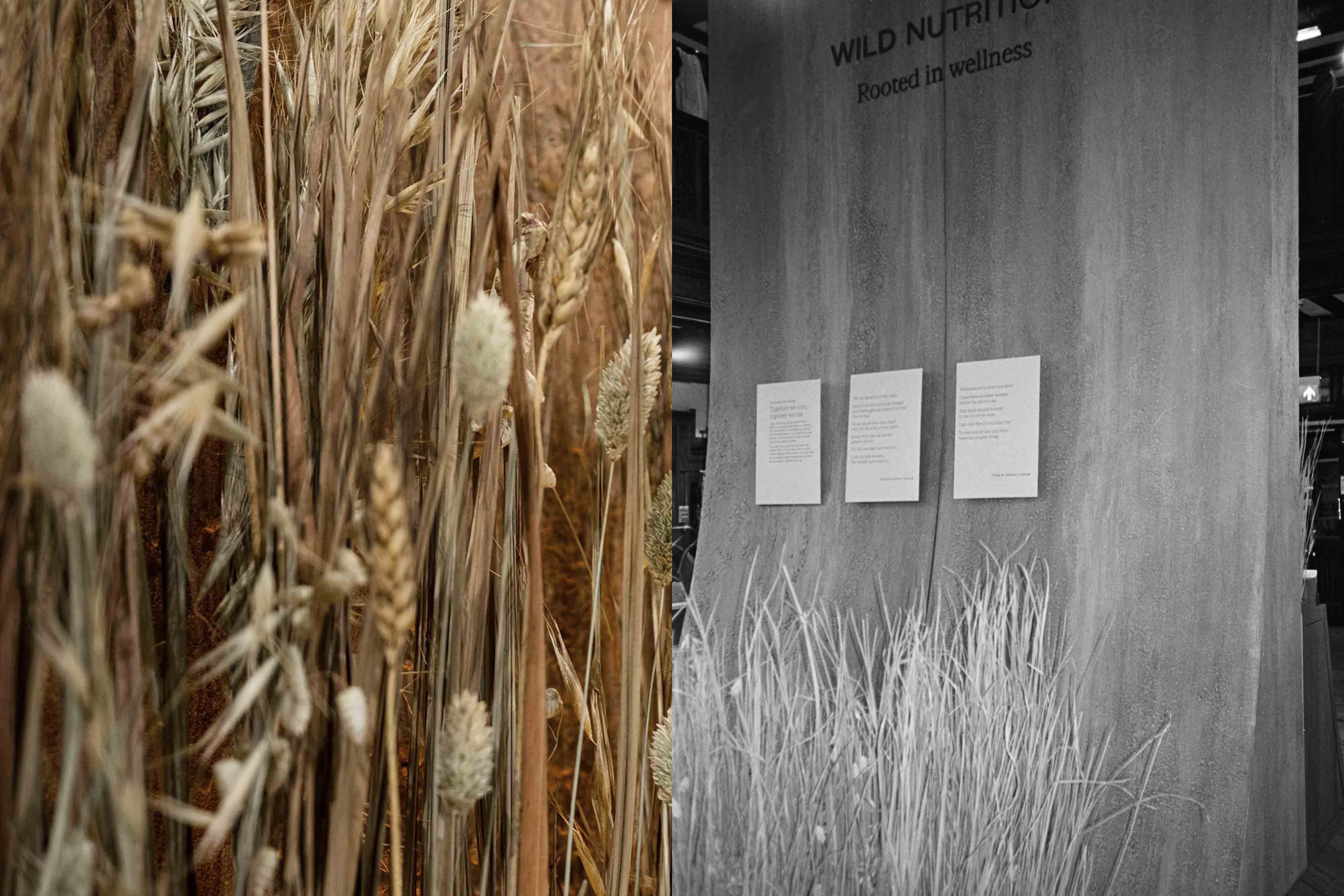 An installation for Wild Nutrition at Liberty London. A singular, earthy form emerges within the central atrium, shaped around key ingredients, from mushrooms to roots. Accompanied by paper-crafted window displays.